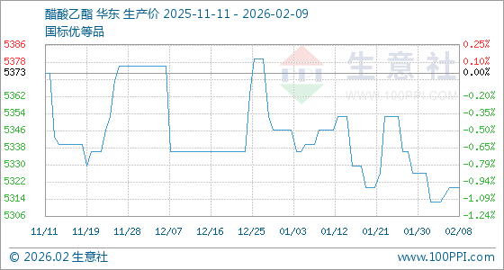 2月9日,生意社醋酸乙酯基準(zhǔn)價(jià)為5320.00元/噸,與本月初(5326.67元/噸)相比,下降了0.13%。